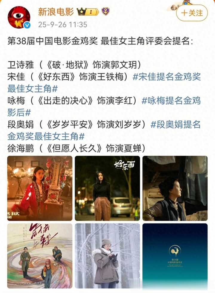 9月26日早上,第38届中国电影金鸡奖官宣提名名单,在备受关注的影帝与影后奖中,最佳女主角的提名名单爆冷,入围女明星惹争议。