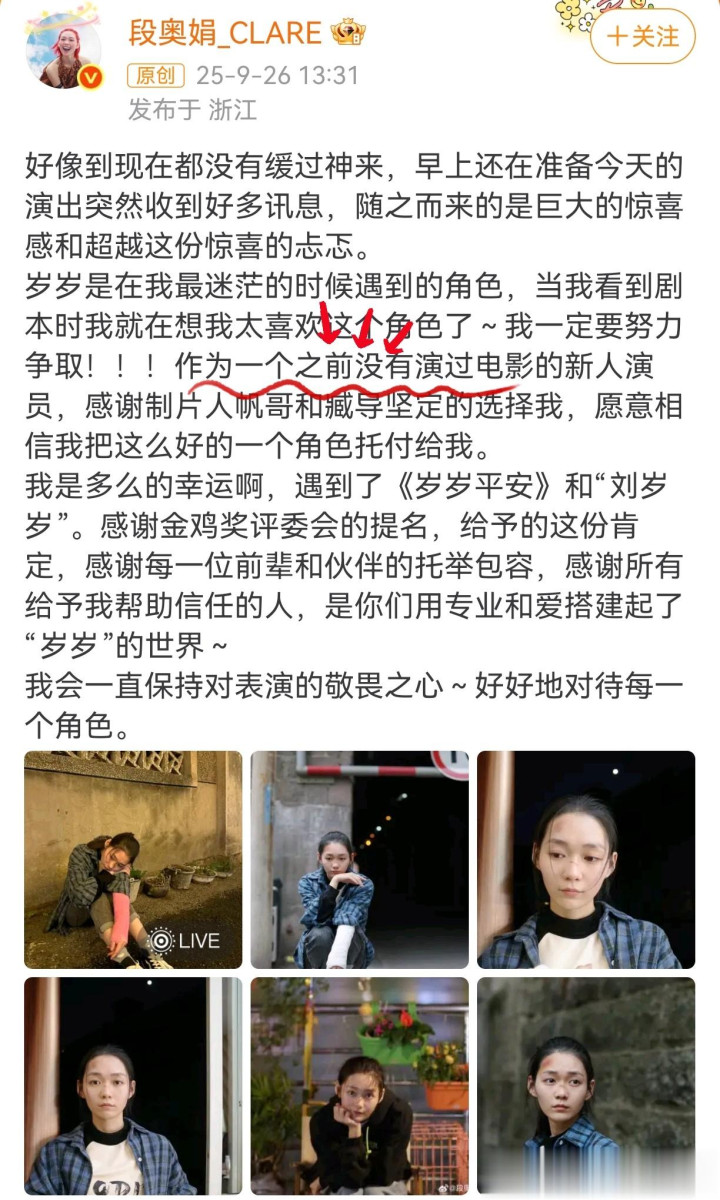 段奥娟也在社交平台回应了被提名金鸡奖影后的激动,从话语中,可以看出这是段奥娟第一次出演电影角色,没有想到就入围提名了,确实很激动。